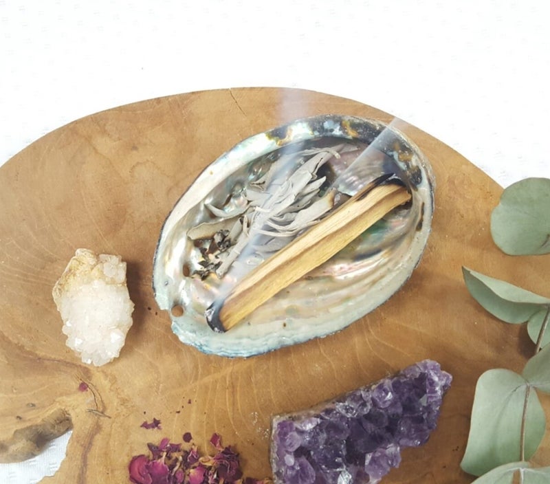 Bestaande uit een Abalone schelp met daarin een aantal stokjes Palo Santo hout en een bundeltje salie.